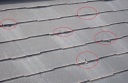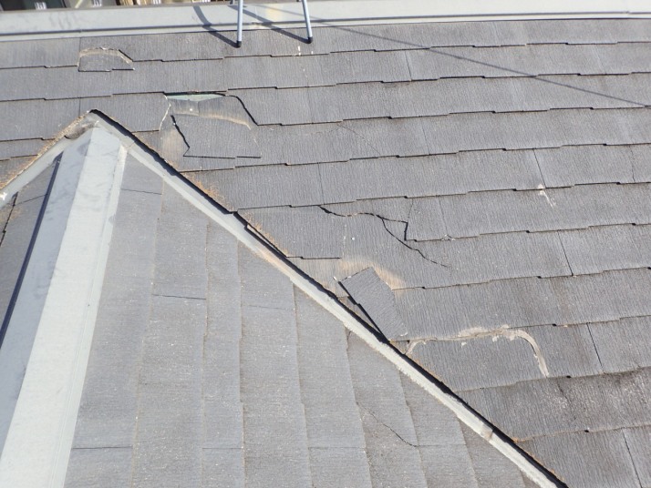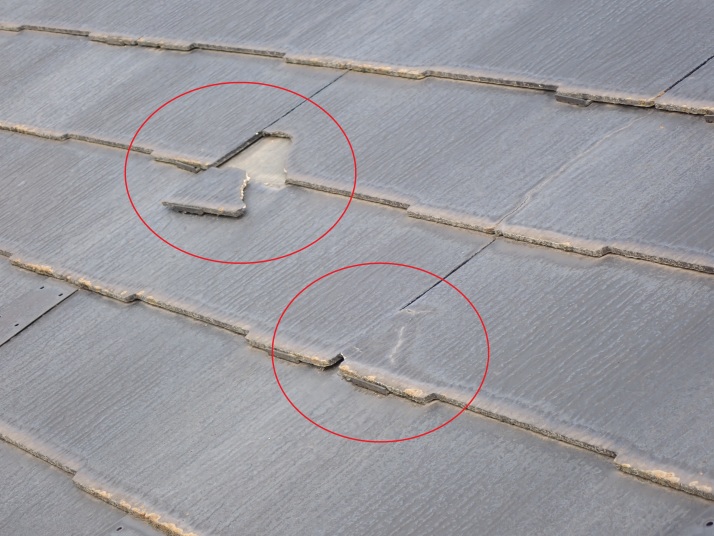 化粧スレートは破損直後に、「破損した事に気が付かない」事が多く、数年後に写真の様な破損が露見することが少なくありません。
