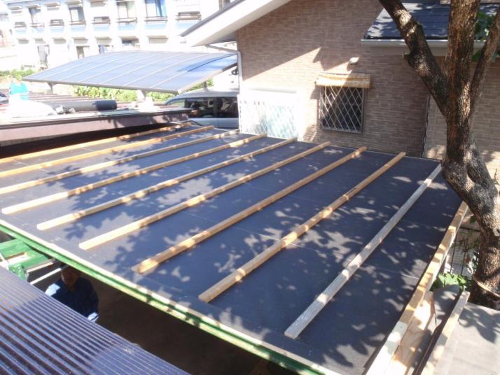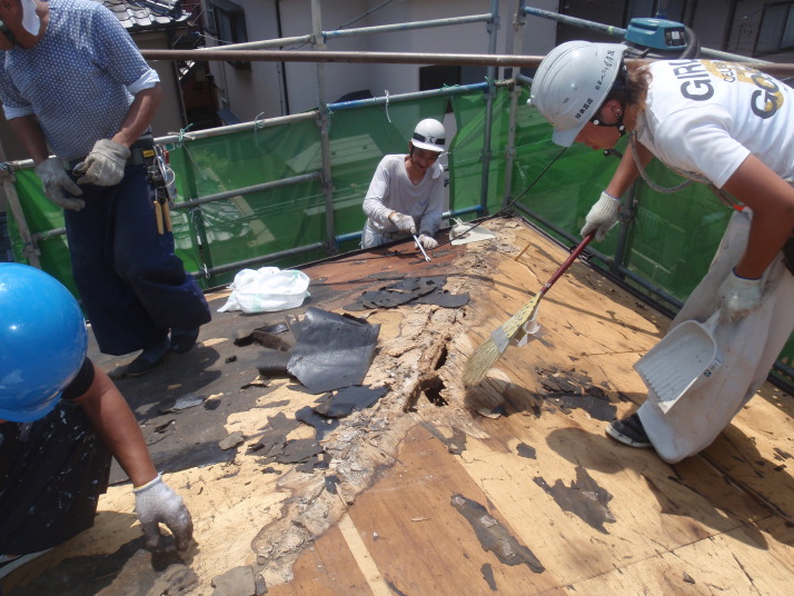 この工事は、雨漏りが生じていたため既存尾屋根材を撤去し、腐食した野路板の交換を含め、葺き替えを行った事例です。