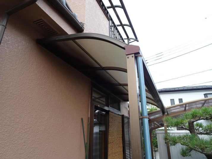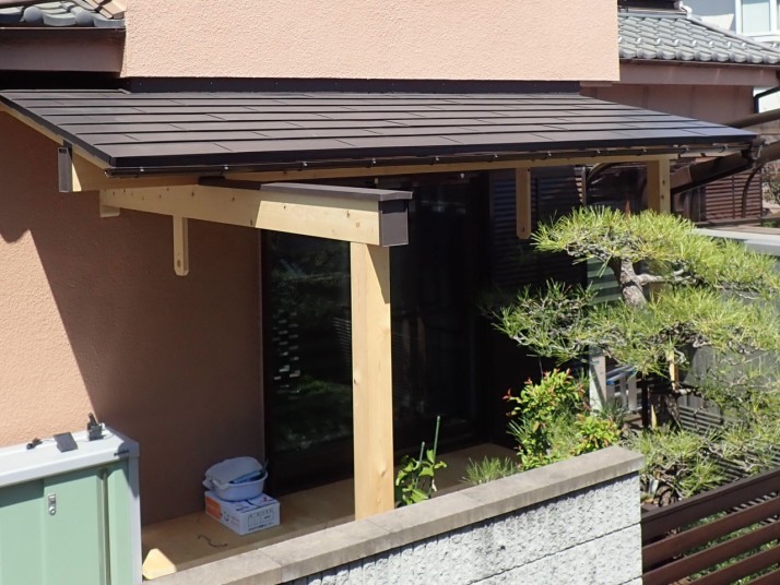 この工事は、鋼製テラス屋根を木造の庇に意匠を変更する工事です。