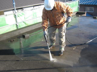 洗浄あたりまえの事ですが、洗浄を行います。 この、洗浄が不十分だと、防水層の剥離が発生する事が有り、重要な仕事です。 |